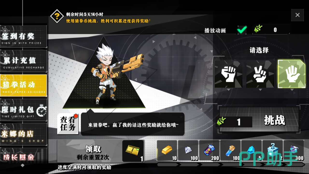 猜拳活动这个玩法的开启要求不是很高的,只要主角等级达到了五级就可以解锁了。在解锁之后,该玩法是要从左下角的玩法图标中进入,不管是点击新手目标还是基金都是可以看到的,左边可以点击来记进行切换。