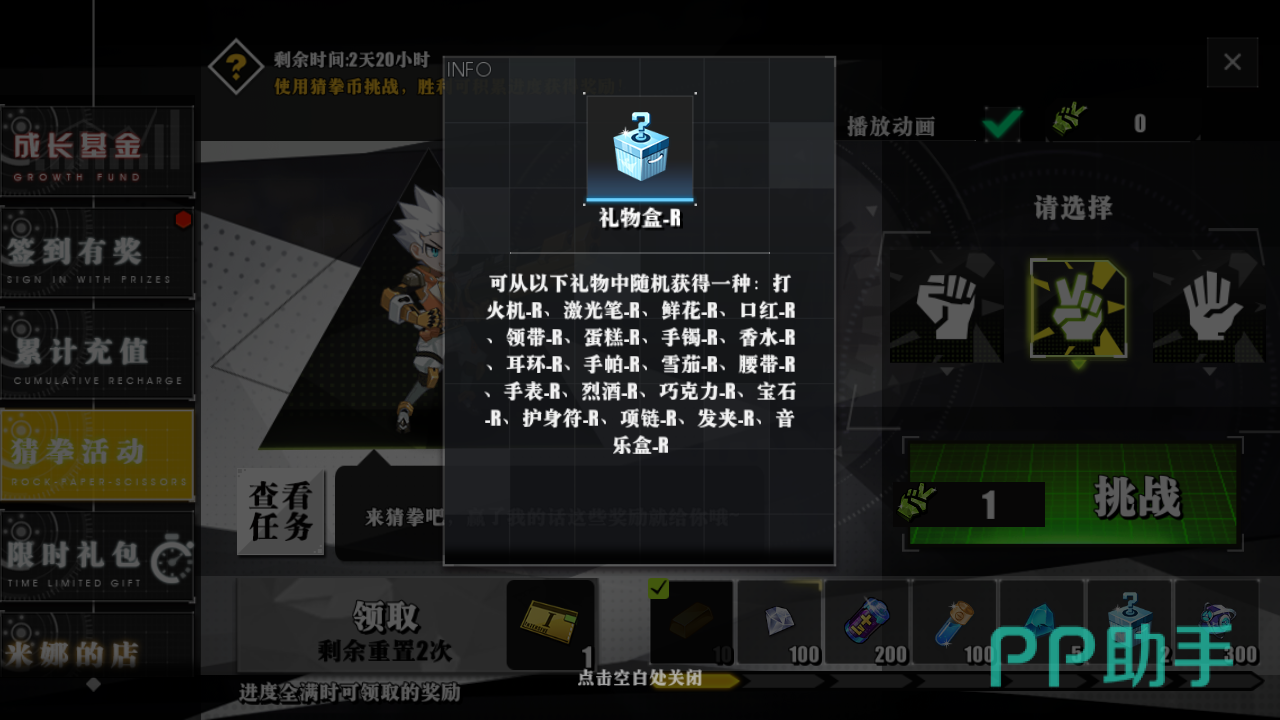 先来说一说猜拳的操作,操作上是相对简单的。玩家点击右边的出拳选择,也就是石头、剪刀和布三个里面选择一个,选择好了之后下方的挑战按钮就会亮起,点击就可以进行猜拳了。