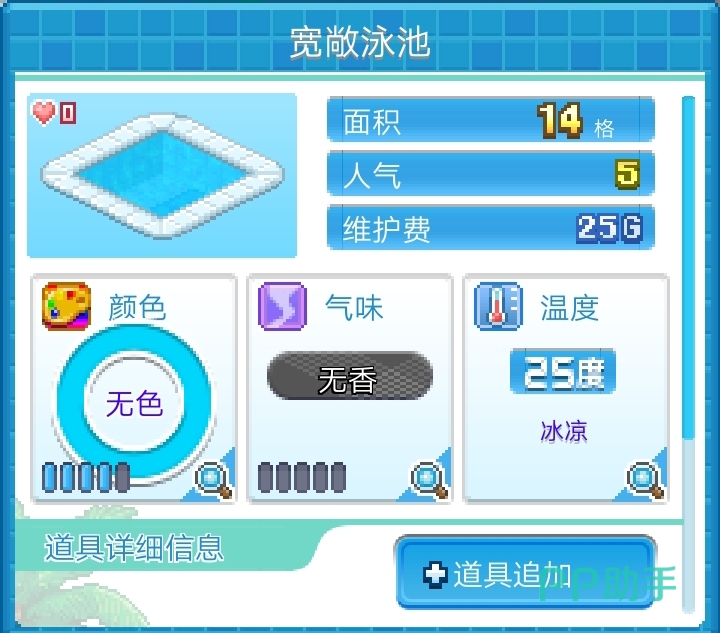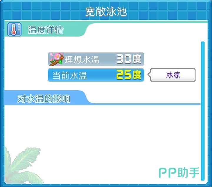 最后一个方向是泳池的温度,泳池里面的水温是可以改变的,玩家可以根据当下季节进行调整。