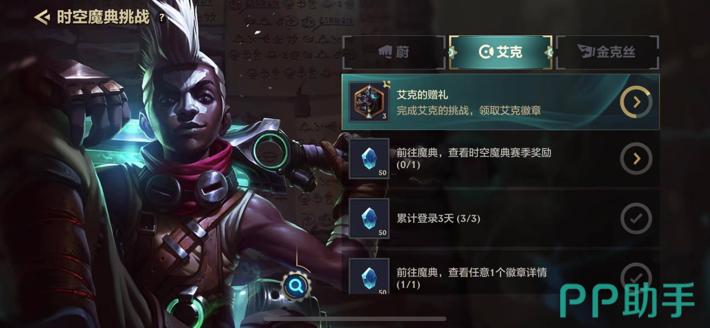 5、大家也可以通过完成蔚、金克丝、艾克任务来获取到专属的魔典徽章,并且大家在完成任务的过程中还能获取到大量的蓝色宝石,凭借着蓝色宝石大家可以去为自己的小小英雄企鹅进行升星哦。
