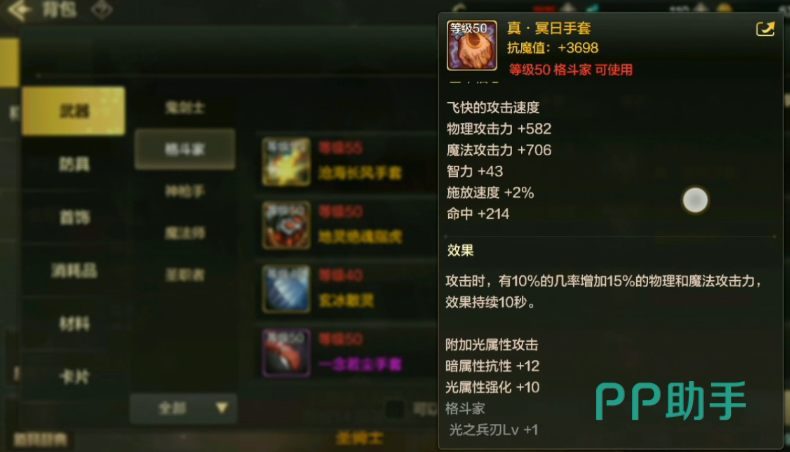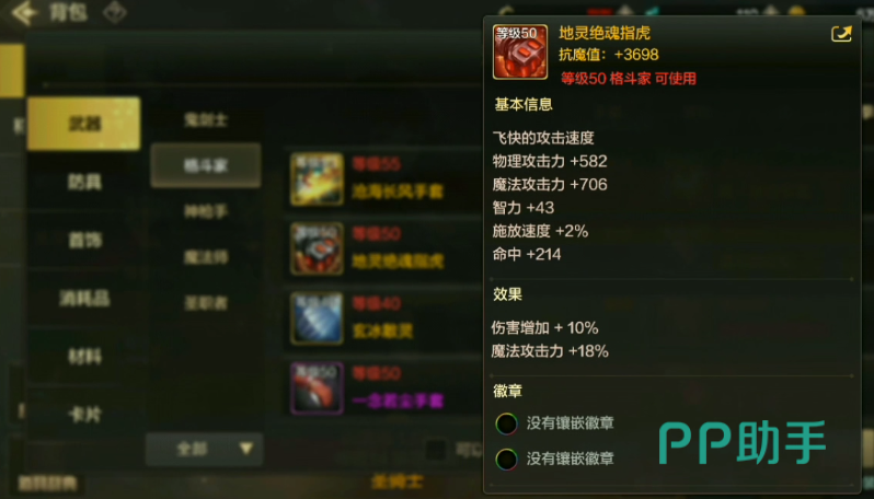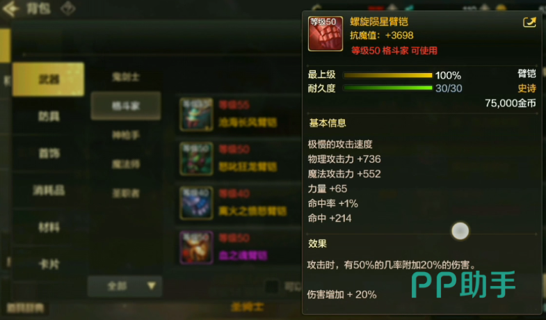 目前版本更新的情况下,格斗家能够穿戴的武器还是比较有限的,主要就是螺旋陨星臂铠和地灵绝魂指虎这两个50级的史诗武器。