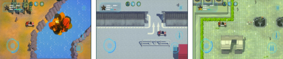 经典的复刻了车色要塞的原型3d场景射击类型的游戏。玩家主要就是开着一辆吉普车去解救被关押在地方战线里边的一些战友,游戏一共有六大关卡,丛林基地到围栏基地再到港口的等多个区域,快速移动着手感控制方向,救出更多的战友将他们送上直升机。