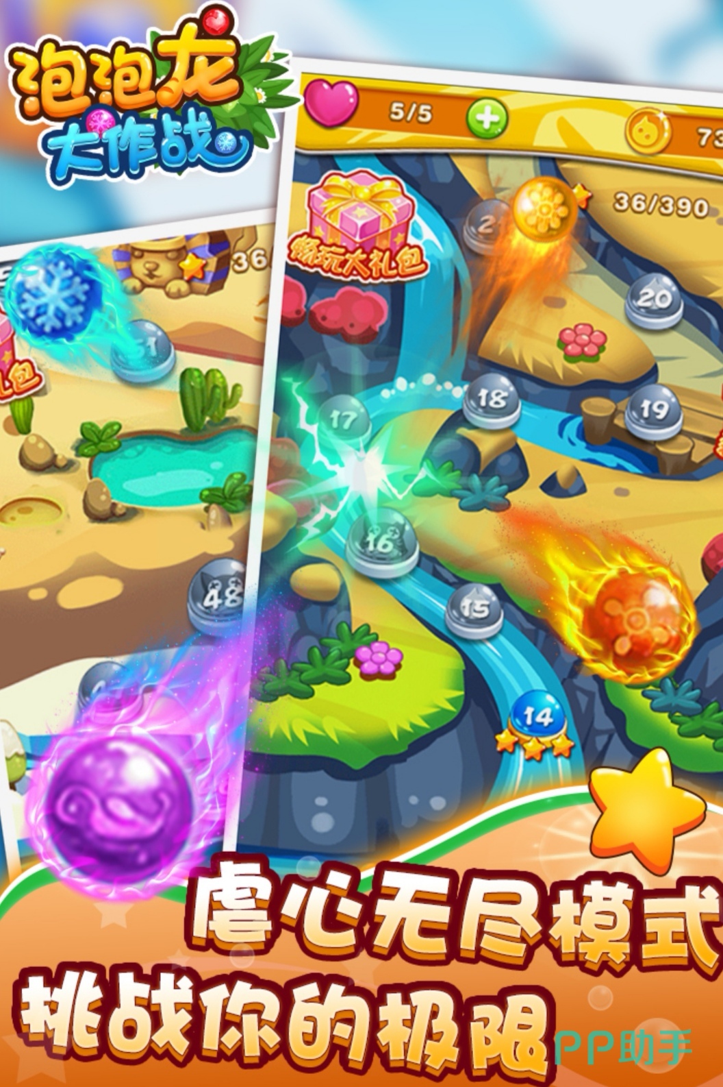 通过这个游戏,你将感受到最经典的泡泡龙游戏,全新的地图、道具和关卡等着你来挑战,给你全新的游戏感受,缤纷夏日的背景给你一个专属于泡泡龙的童年回忆。全新的压迫玩法和超过60关的关卡挑战,不一样的玩法选择给你别样的新鲜感。