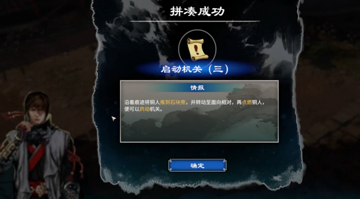 将铜人的玄机和痕迹的成因拼凑一起获得【铜人与痕迹】,将其与石板机关拼凑获取【启动机关一】。将其与刻字的意思拼凑获取【启动机关二】,将其与石板旁的灰烬拼凑,选择有关系,选择铜人原本的位置之后选择有其他原因获取【启动机关三】。