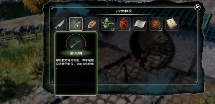 我们之前在摩尼教的任务流程中获取到一把金玉钥,看起来是不错的东西,这里我们将金玉钥出示给仆役,仆役怀疑金玉钥的价值,再出示【钥匙价值证明书】,我们就可以直接进入了。这里需要注意,一旦进入村长宅之后就必须完成任务才可以出来继续探索,是一段封闭的线性流程。