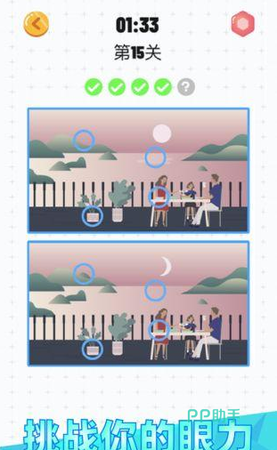 这是一个找不同的游戏,每一局会出现两张相同的图片,要求玩家在两个图片当中找出不一样的地方,圈出来即为获胜,玩家如果在规定时间没有找出不同之处的话,则视为玩家挑战游戏失败。