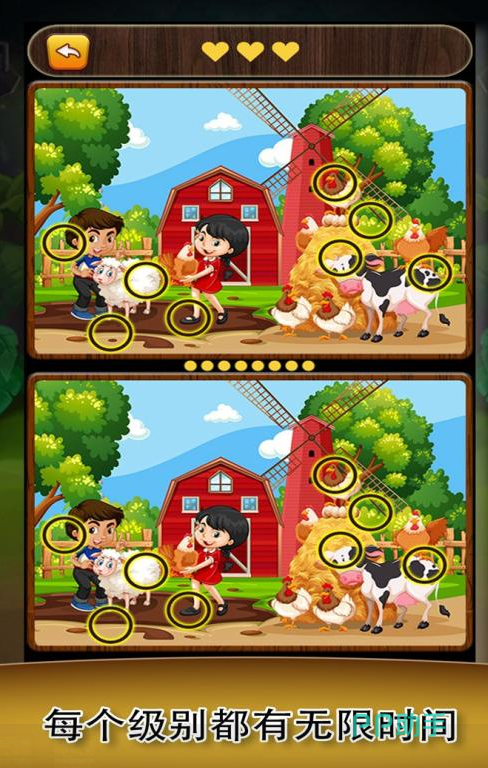 玩家们需要在此款游戏中找到不一样的地方,点击不同之处圈起来,在游戏中玩家们美每一关卡只有3次寻求帮助的机会,一共有8张图,非常适合玩家们玩的一款游戏。