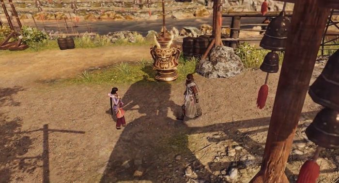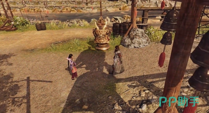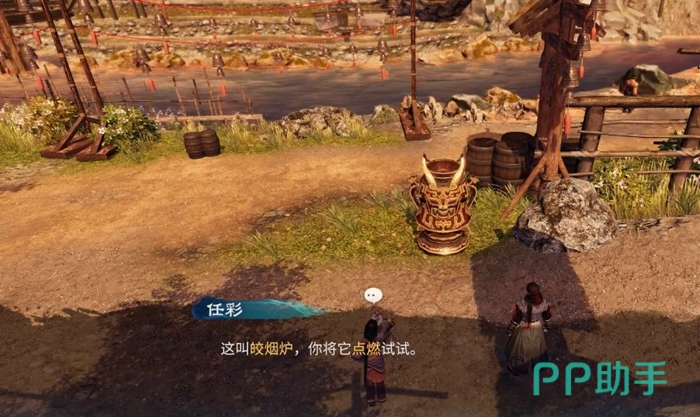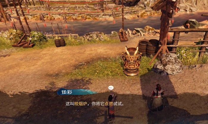 在我们结束游戏的序章来到长空村之后可以看到任彩,与其互动之后将苹果出示给任彩可以获取关键物品豆腐渣香苹炖肉。这个时候我们可以看到右侧有一个火盆,就是圣火了。互动之后得知这个圣火叫做皎烟炉,我们可以在互动过程中选择将其点燃,点燃之后我们就解锁了这个圣火传送地点。