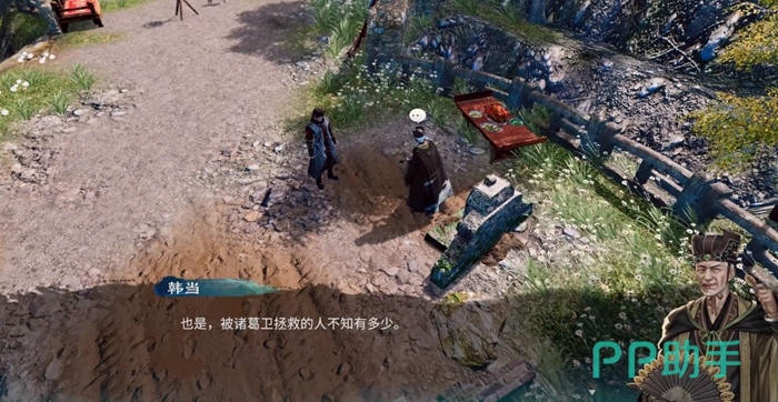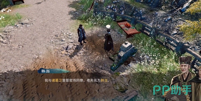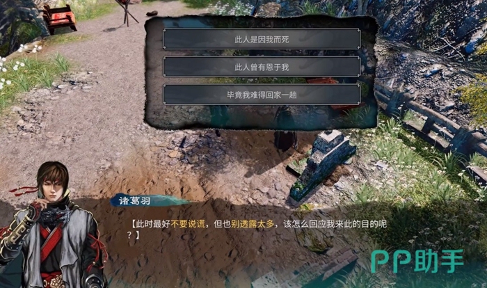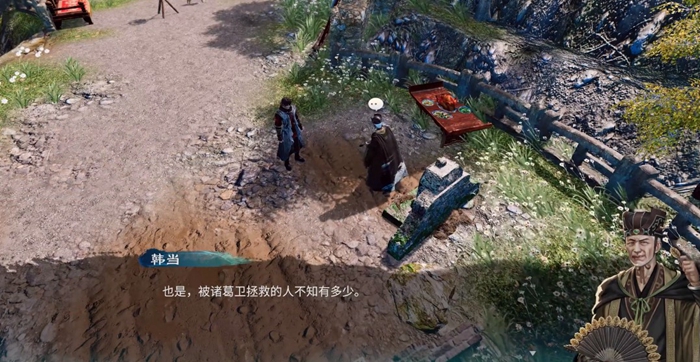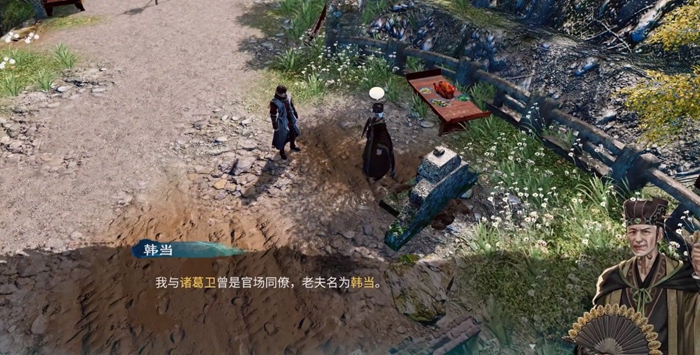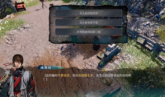 到达长空村之后先找任彩触发剧情推进主线,随后来到父母的坟墓前,这个时候看见了一个神秘热。搭话后得知神秘人就是韩当,他自称一起与诸葛卫为官场同僚,韩当猜测我们与诸葛卫也有一些关系。这个时候游戏内会有提示,诸葛卫在官场得罪过许多人,而且主角诸葛羽也从未听说过韩当的名字,这个时候应该要谨慎行事,其实就是要隐藏自己的真实身份,但是不要说谎,也不要透露太多,不然会被拆穿。
