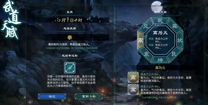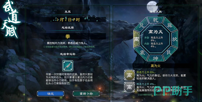 离为火的卦象是初始的攻击力最高的,外卦和内卦都是提升我们的攻击力,一共提供了12%攻击力的加成。对于我们前期的战斗以及一些互动物的成功触发是非常有帮助的,这里因为我们选择的日期是1月1日,所以我们的初始幸运物是小刀。