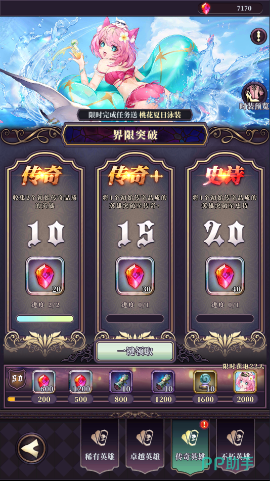 4、界限突破:主线剧情关卡在通关第二章后可以开启界限突破,这个活动是永久的。除了可以得到召唤券作为奖励外,还能额外获得领取桃花夏日泳装。