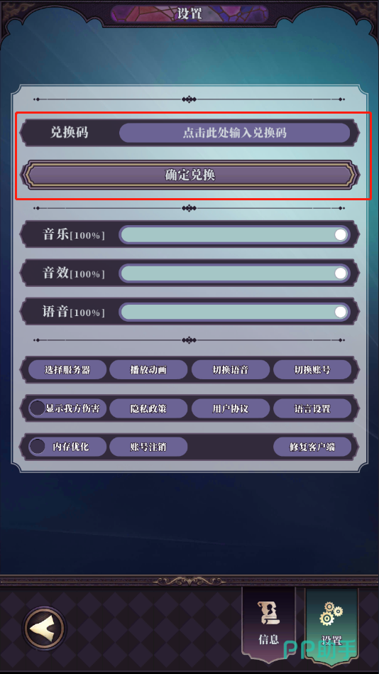 2、如何使用:首先进入到游戏中的主页面位置,点击左上角的头像进入信息界面。然后点击右下角的“设置”按钮,在上方输入兑换码然后点击“确认兑换”即可。