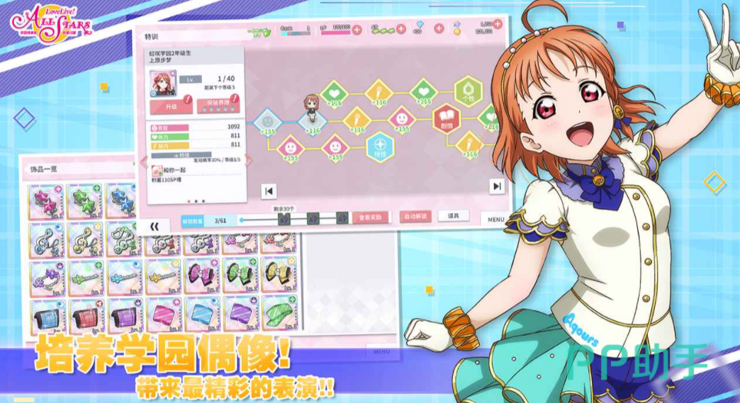 在游戏中,玩家将体验到原作IP独有的游戏角色。在其中,玩家通过都属于自己的培养学园偶像,不仅能让学园偶像在表演时有更出色的表现,还能获得新故事篇章、可在演唱会中使用的服装和个人语音等等。 来培养出专属于你的学园偶像团队吧!