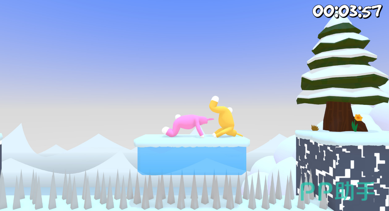 这是一个双人合作的游戏,每个关卡的地图都不是一样的,一个在前面走,一个在后面配合,当遇见台阶时,两个兔子的步骤一定要一样,这样才能吸住对方的脚,通过奔跑的力量,可以助力上到台阶上面,如果掉进水里的话,玩家们就需要从掉落的地方再次起跳,超过3次的玩家需要重头再来。