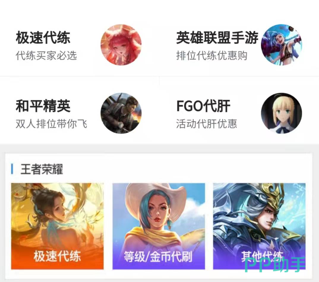 交易猫中的王者荣耀代练分为极速代练、金币代刷、等级代刷,甚至还有指定英雄上分、KDA代刷,一些活动积分的代刷服务也可以上交易猫找到。