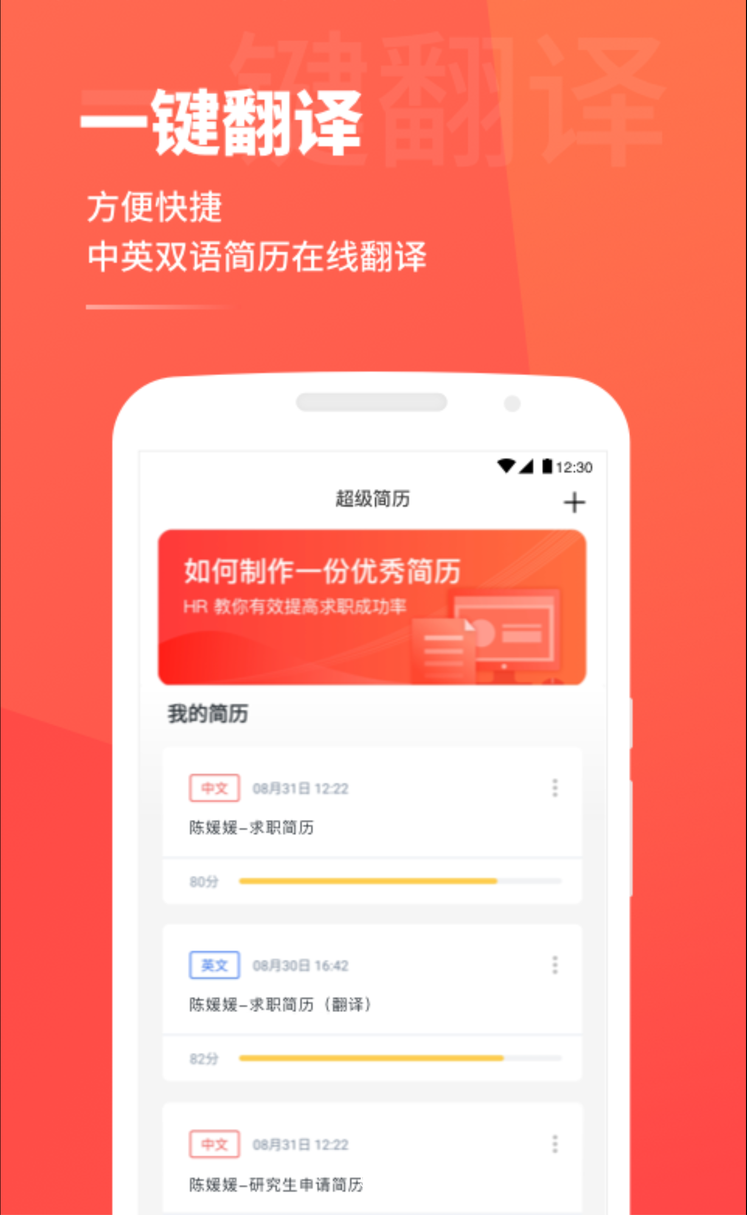 一款专业高效智能简历软件,支持中英模板切换,中英双语简历,一键在线翻译,手机和电脑同步快捷制作,更有信息加密,信息存储等多重功能,堪称简历翻译神器。
