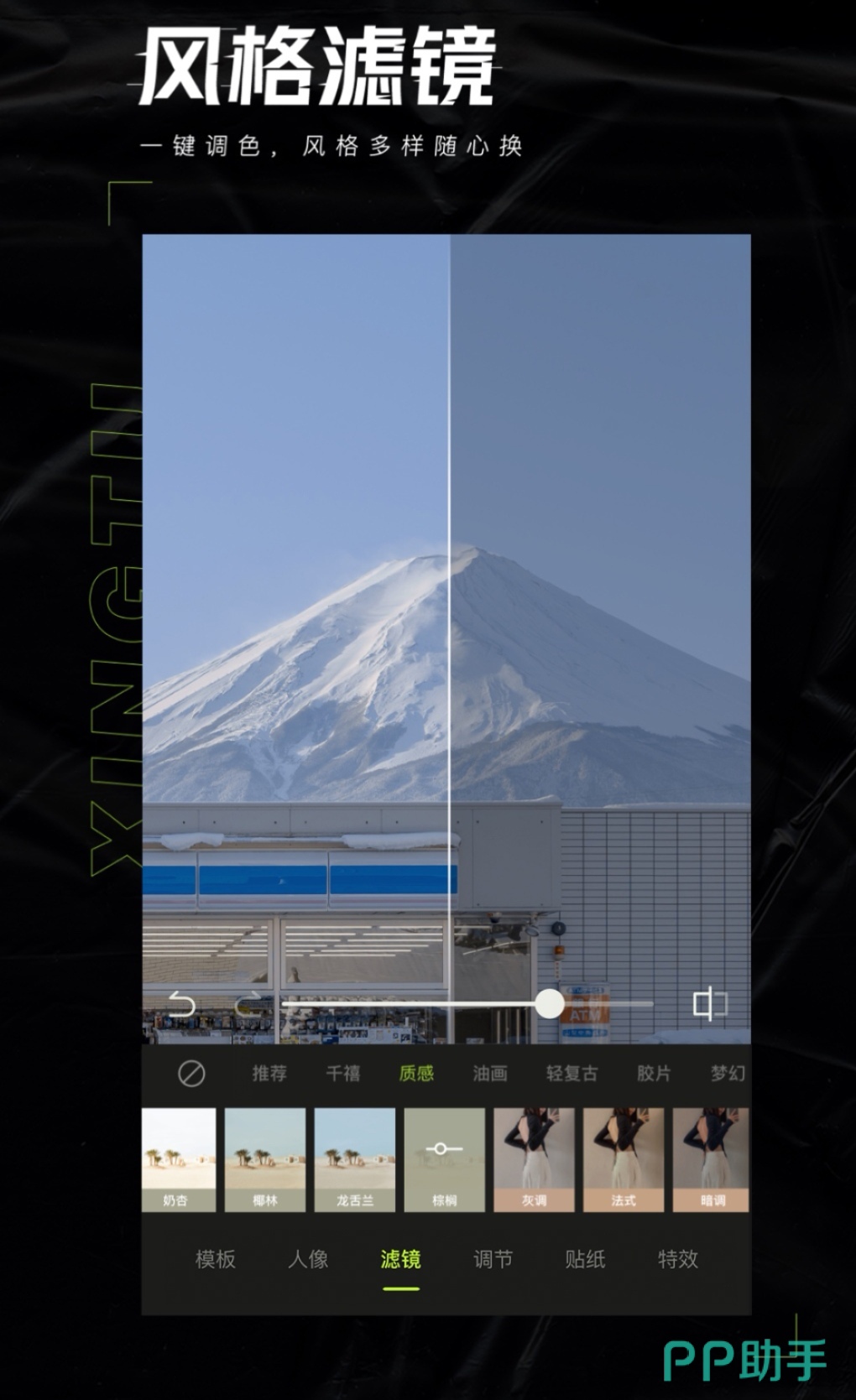 用这款软件套用各种图片模板,快速的对图片进行剪辑,激发你的个性化创作。你还可以对影响照片的地方进行裁剪,套用不同风格的滤镜,最终找到适合自己风格的。