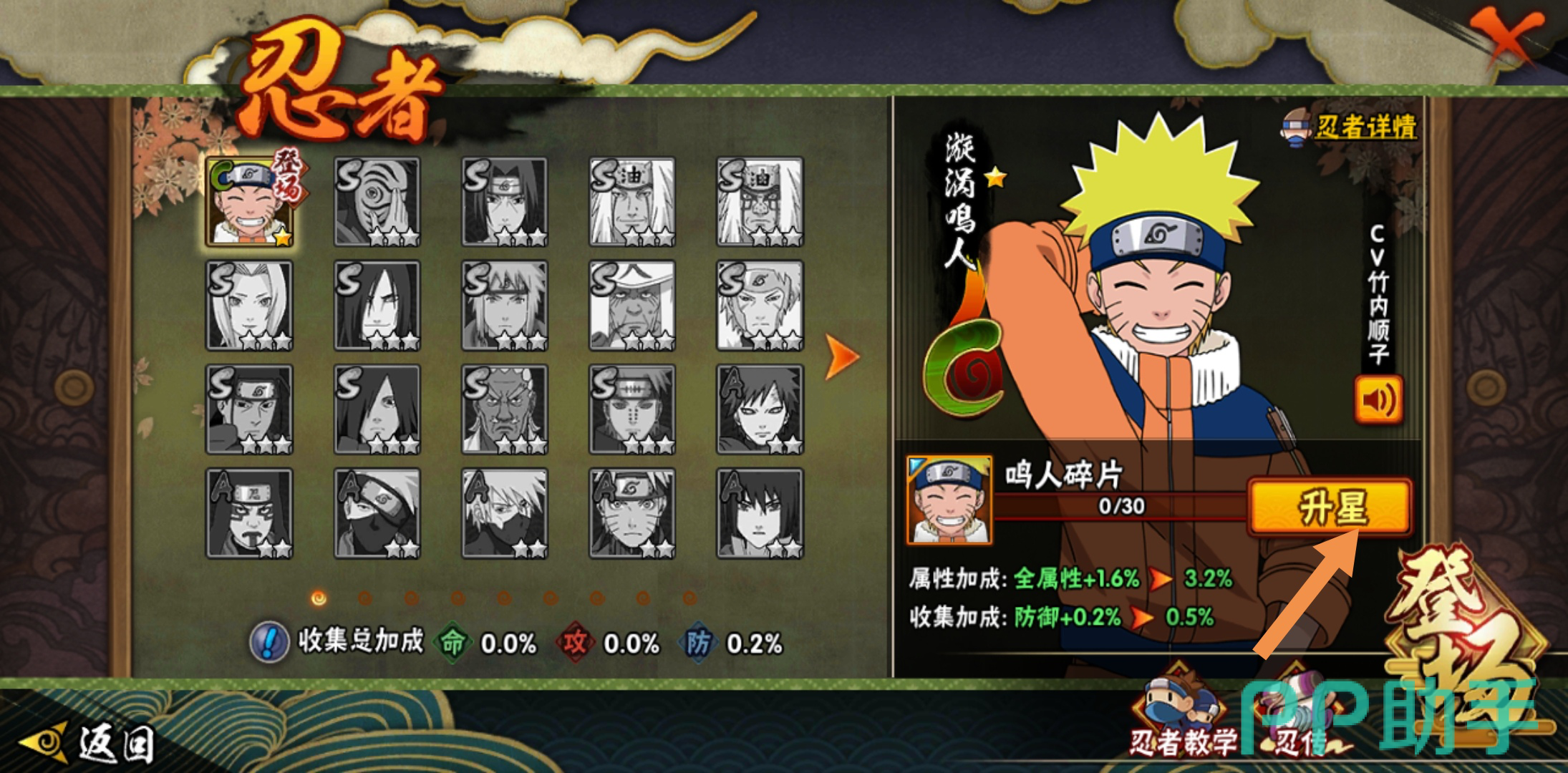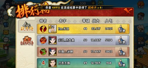 收集越多的忍者人物也是一个很好的办法,忍者越多玩的花样越多,不同的副本有时需要不同的忍者才能刷过,所以所拥有的人物也是一个关键点。