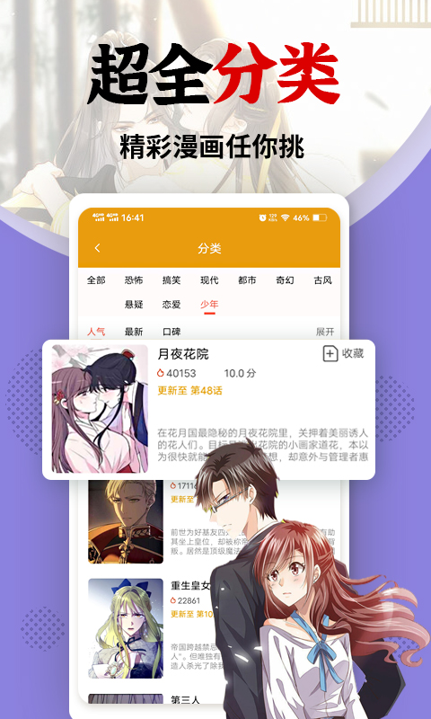 国内分类较全的漫画app,用户可以根据自己的喜好找到任何感兴趣的漫画分类,古风、都市类漫画应有尽有,天天更新的进度让用户不需长时间等待更新。