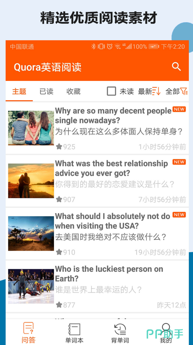 Quora英语阅读拥有精选的优质阅读素材供小伙伴们阅读,并提供方便的查词、整句翻译功能,让小伙伴们快速积累自己的单词量。这款app不仅可以用来学习英语,还可以带小伙伴们了解世界各地的文化风俗。