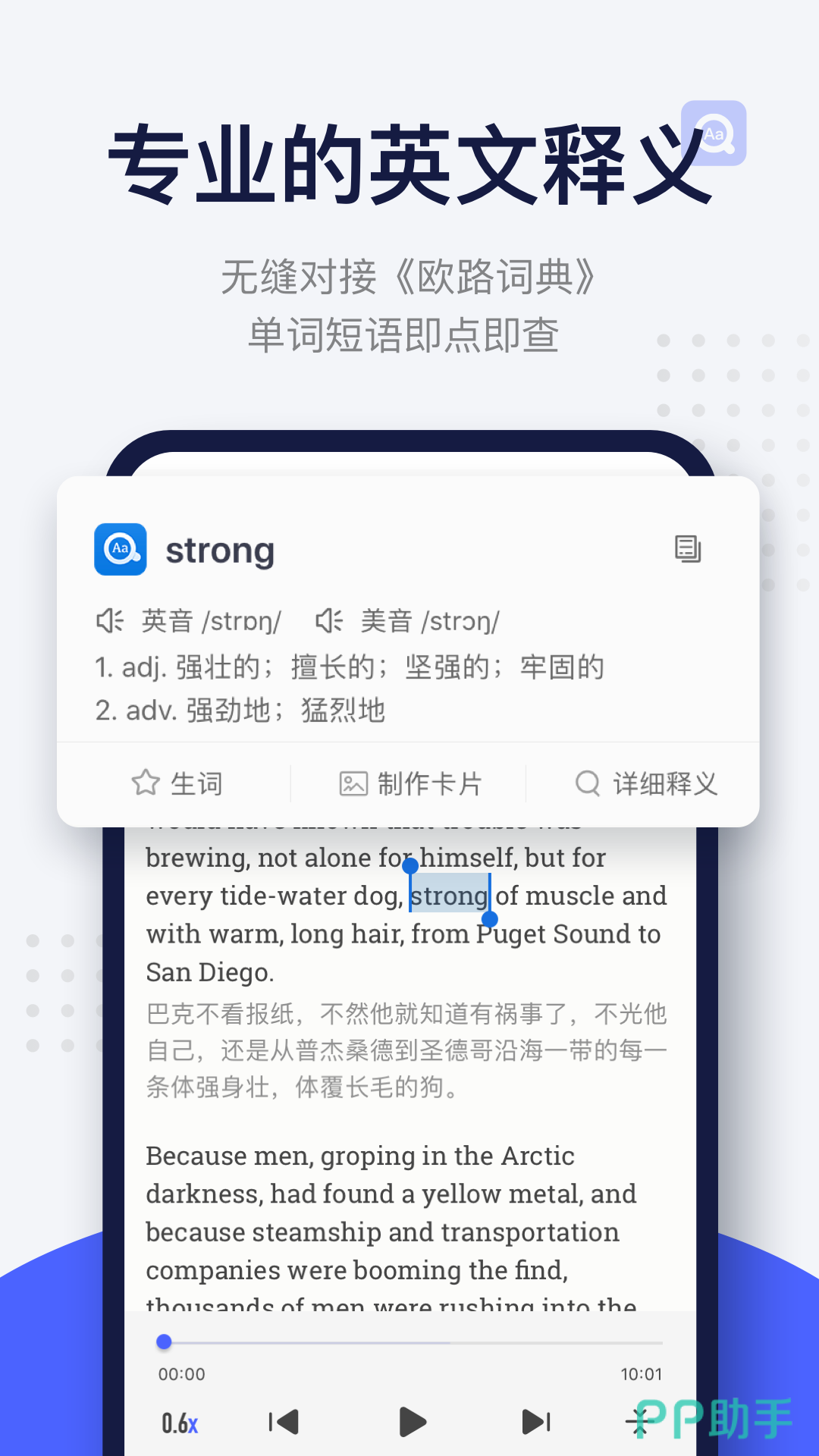 每日英语阅读一款专注阅读正版英文的小说神器,丰富的英文读物让你阅读不停歇,名著精读一遍到位双语字幕准确释义,权威字典在线查让你阅读不再出错,每日一听你也能学会英语。