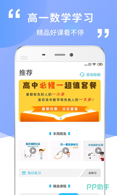 这款应用完美的覆盖了必修一课本的内容,给用户提供最优的学习方案,让用户可以尽快掌握必修一的所有内容。专业的教学团队会让用户在学习的过程中爱上数学,这会让用户之后学习数学更加轻松.