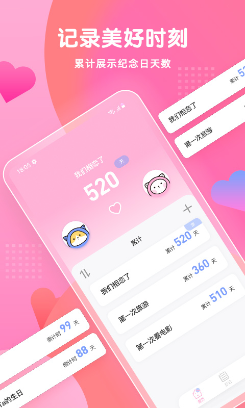 时光之恋恋爱记录是一款记录恋爱日常的软件,纪念日倒计时、生日倒计时、见面倒计时让你的恋爱生活充满期待,你可以将拍摄的恋爱照片上传到软件上,让你们的恋爱生活充满粉色泡泡。