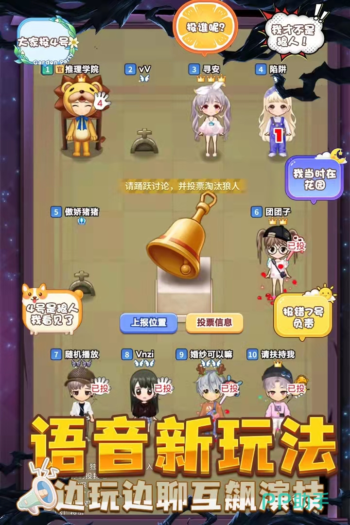 游戏放在了一个神秘的庄园中,在庄园里有狼人和平民两种身份。狼人的任务就是偷袭平民,而平民则需要通过自己的判断,投票将狼人选出来,非常考验大家的判断能力。