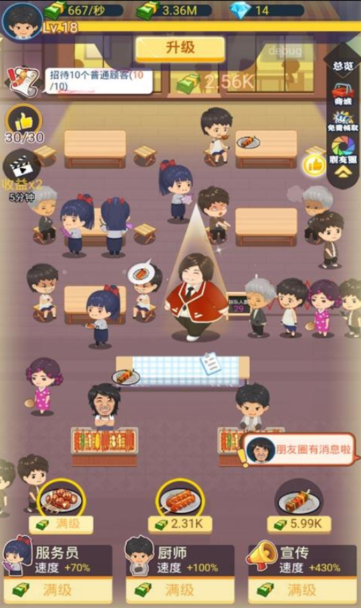 一款充满乐趣的小游戏。在这里,玩家可以自由的体验快乐的模拟经营,打造特别的餐厅。从不断招揽客人开始,给客人点餐上菜,赚取收益升级餐厅设施。尽情享受游戏乐趣吧!