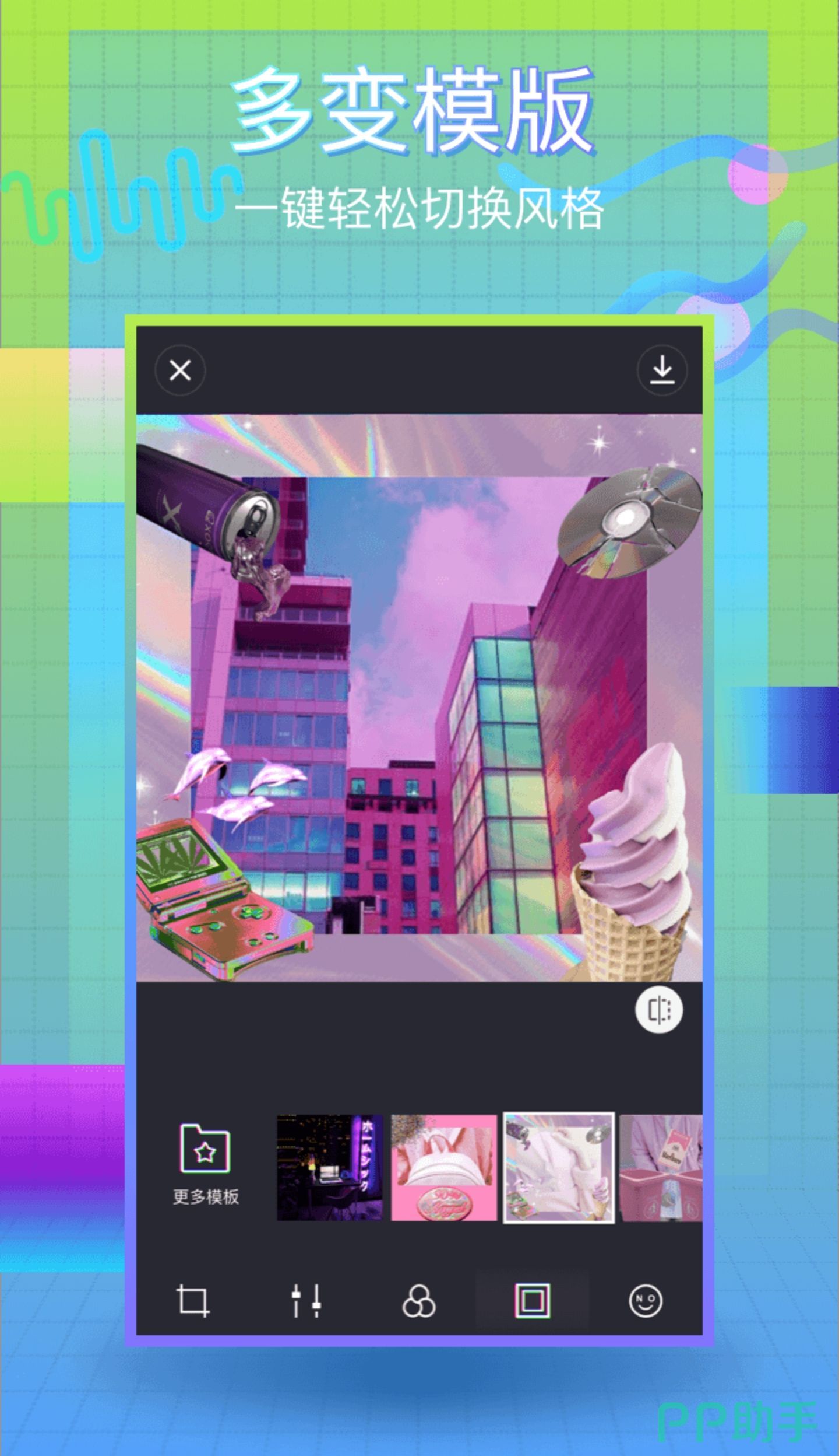 蒸汽波相机是许多网红都在用的二次元拍摄玩法件,其中左右对称脸拍摄就是这个应用主打的功能,用户们可以自由调节照片角度,在拍摄的时候就可以添加滤镜预览各个作品,最终按一下快门键即可生成属于自己的对称脸照片。