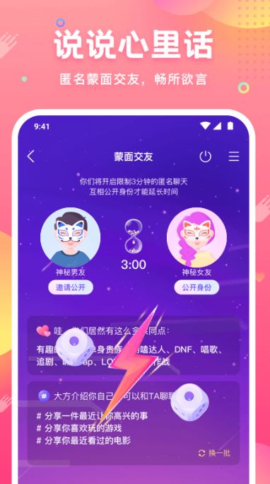 面具聊天让你在茫茫人群中找到与自己灵魂最契合的朋友,更有面具公园、偶遇缘分等功能帮助你隐藏真实的身份,可放心与附近的人聊大家感兴趣的话题。