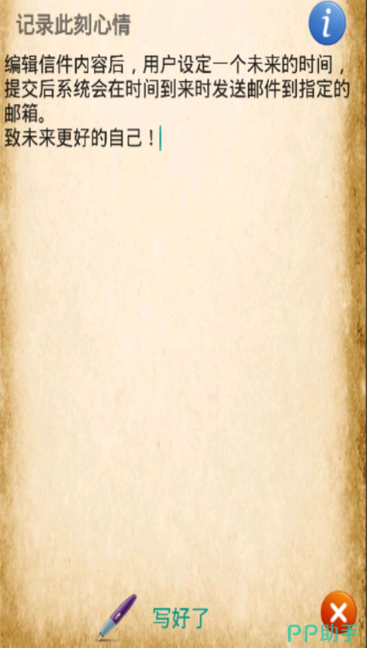 时光邮局是可以让用户们在指定未来时间发送信封的应用软件,整个软件属于一款轻应用,仅可以使用牛皮纸张记录自己想要说的话,还能通过粘贴各种有意思的贴纸来丰富自己的书信内容。