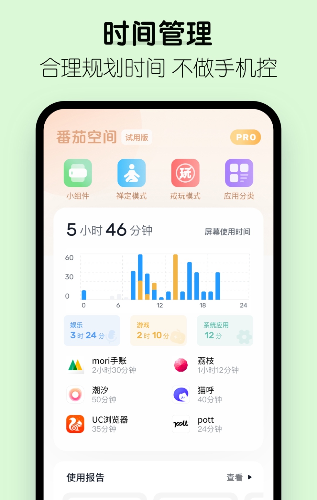 放下手机,彻底地拥抱生活,让自己努力成为一个更优秀的人。合理规划你的时间,后台会自动记录每个软件的使用时间,也会统计你的累计专注时长。