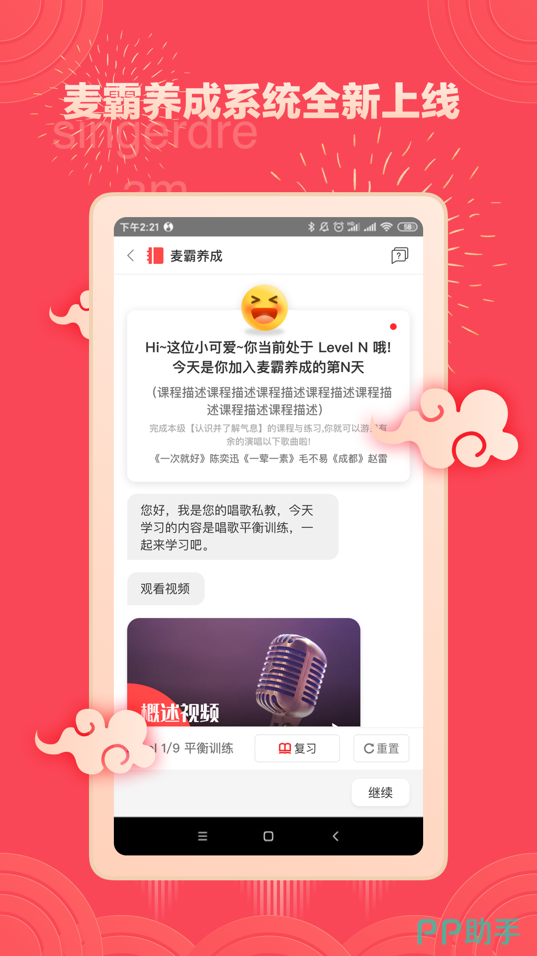 这是一个学唱歌K歌教学的软件,有8000万助力麦霸养成,模拟一对一在线教学,帮助小伙伴们提升唱歌技巧,还拥有新手奖学金,训练计划:声音测评、问答、直播等等,好玩的功能等你发现。