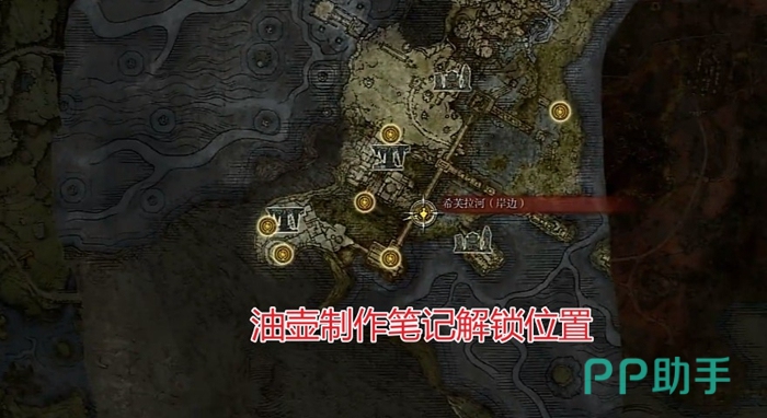 在艾尔登法环前期的流程中我们进入艾雷教堂在流浪商人列伽处可以购买到制作工具,购买之后如果获取到对应的制作笔记并且收集到所有的必备素材之后就能够进行物品道具的制作了。而记载有油壶的制作笔记就是流浪战士制作笔记17了。我们先来到希芙拉河(岸边)这个赐福点。
