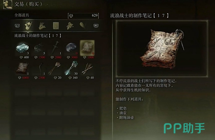 流浪战士的制作笔记17中记载了三种道具的制作方法,分别是肥皂、油壶以及附绳油壶。油壶是艾尔登法环支线任务中一个重要的道具,所以说基本上是必须要学会制作的。此处的商人比较隐蔽,大家需要耐心寻找一下。
