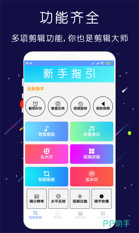 不断更新的一款视频剪辑app,不仅有着较全的功能,为方便上手还设置了新手指引功能,带领用户走一遍各种功能的使用,快速了解每一个分区的使用方法。