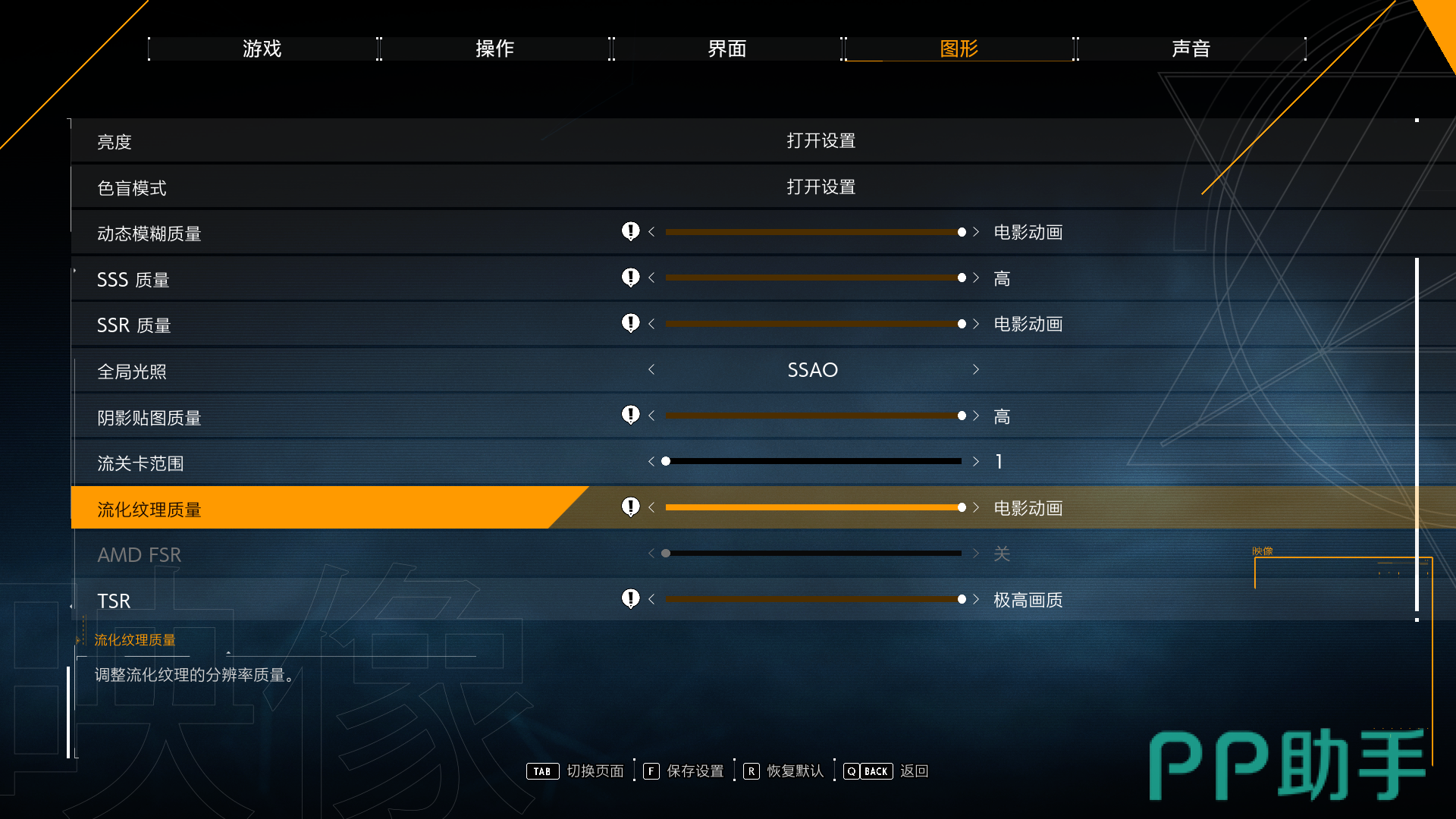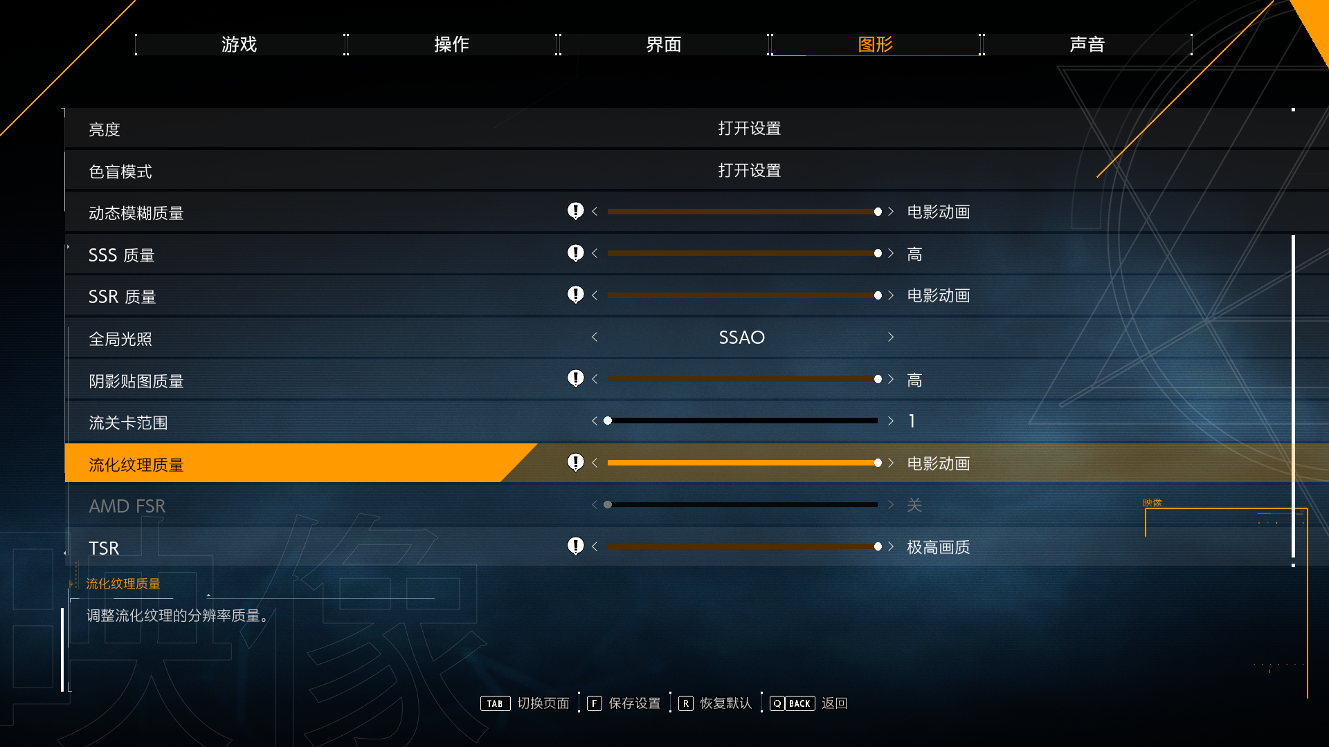 推荐调整的有“AMD FSR”优化,如果感觉画面卡的话,就将这一项调整至“性能”,如果认为画面差的话,就调整至“极高画质”。还有些玩家会觉得画面有些模糊,此时可以关闭“AMD FSR”打开“TSR”,TSR是虚幻引擎采样技术,打开这一项会明显感觉到清晰。