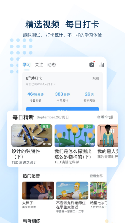 有趣的打卡功能可以帮助用户记录每天的学习情况,视频对话内容将加深英文口语能力。感兴趣的用户可以直接点击下方的下载按钮。