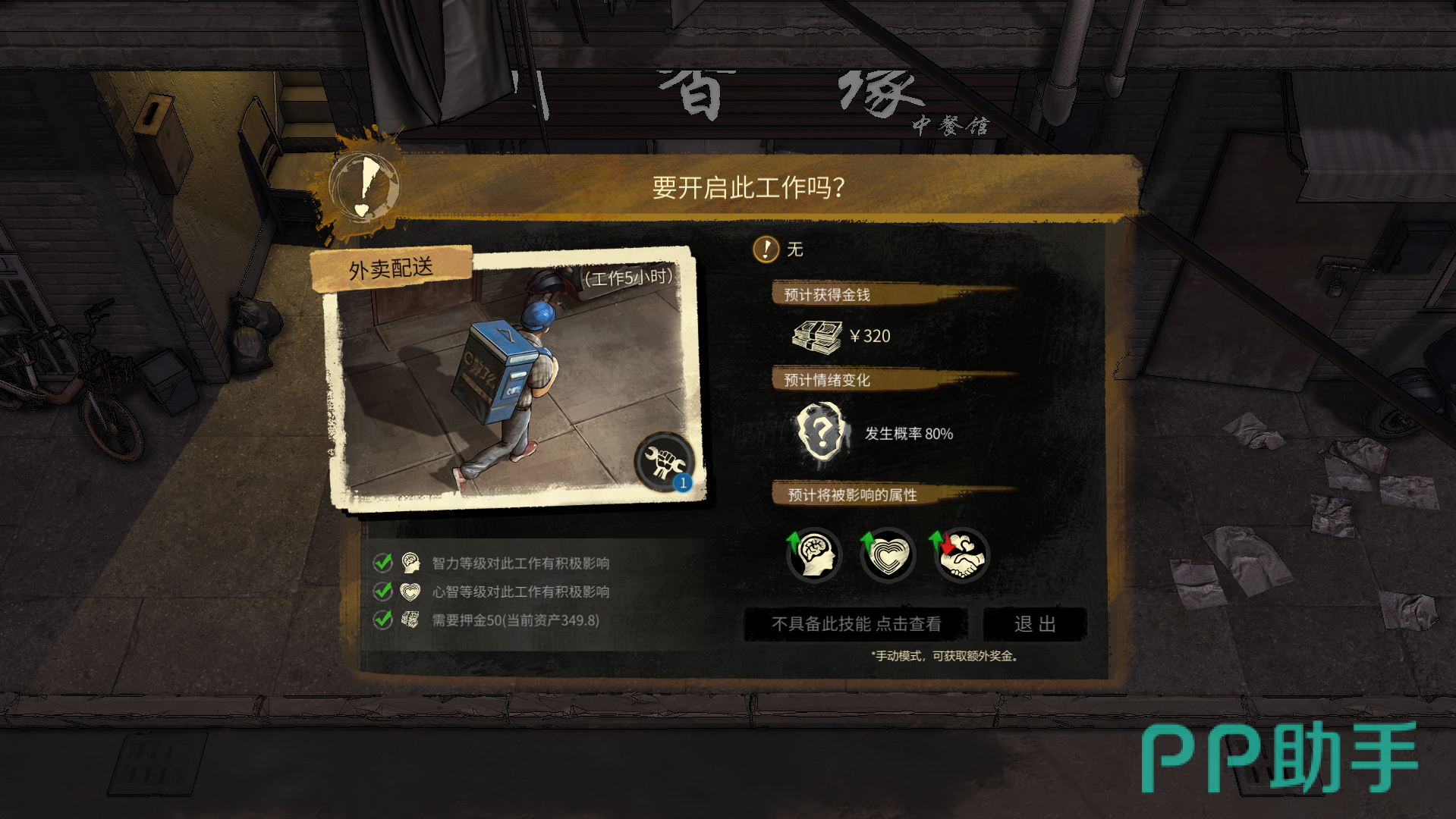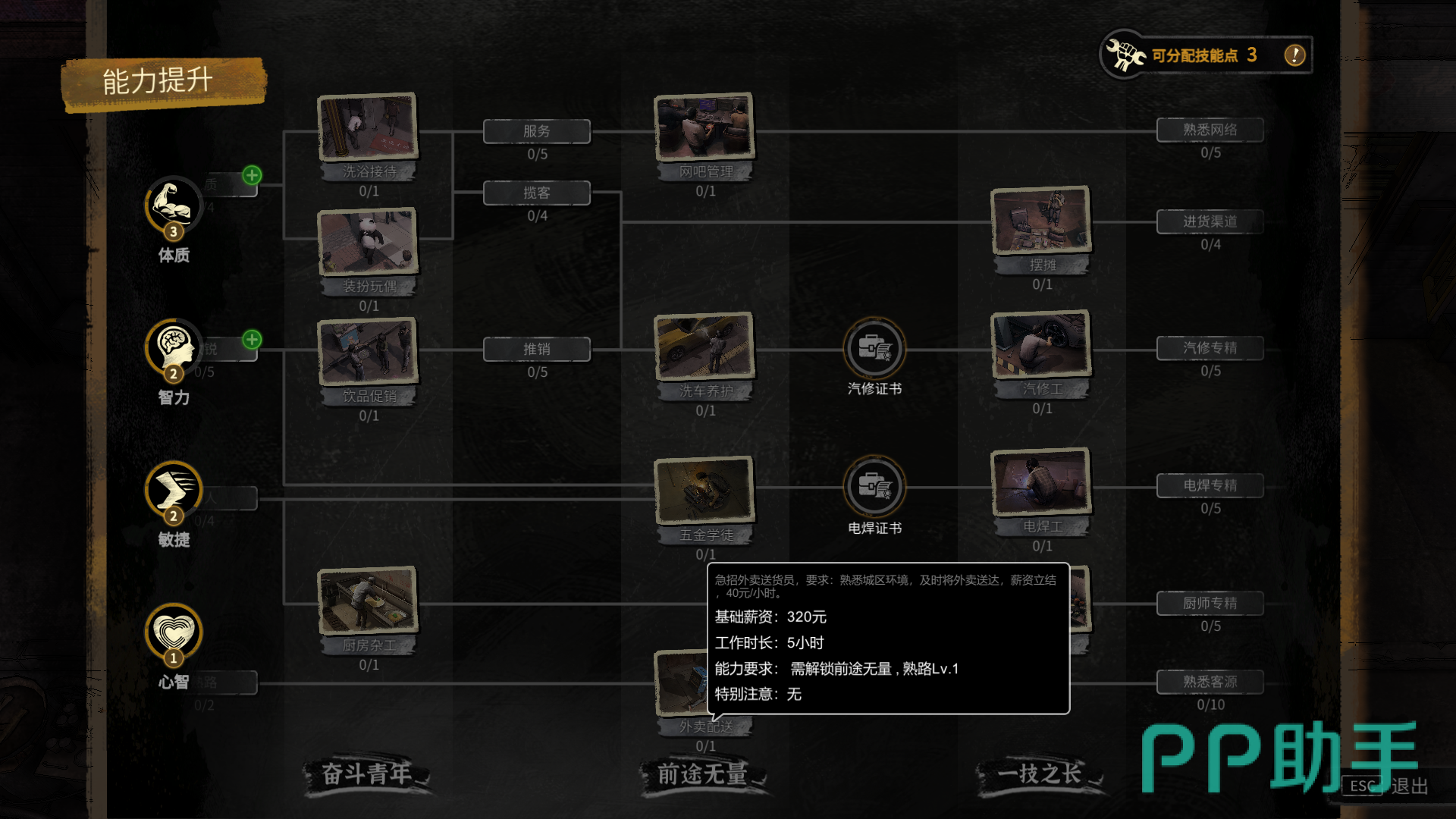 这时我们首先需要解锁“前途无量”的社会评价,然后需要将自己的熟路等级提升至1级,再使用1技能点学会“外卖配送”的技能,就可以去做送外卖的工作了。