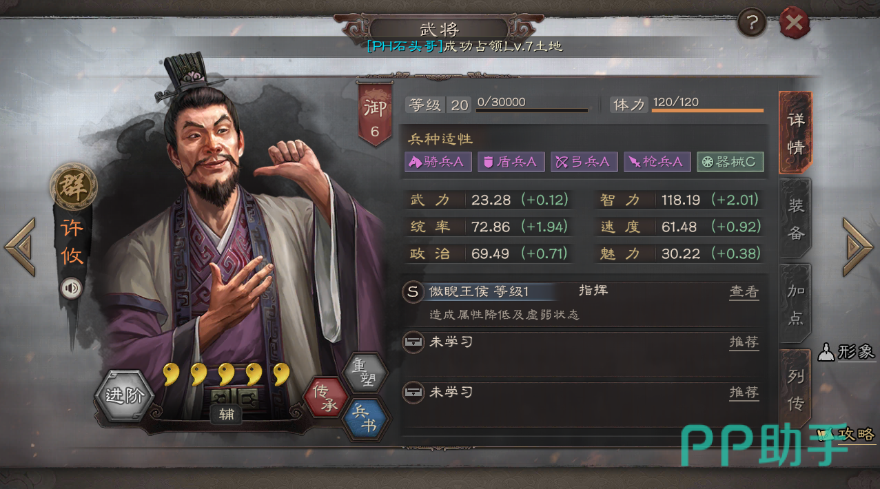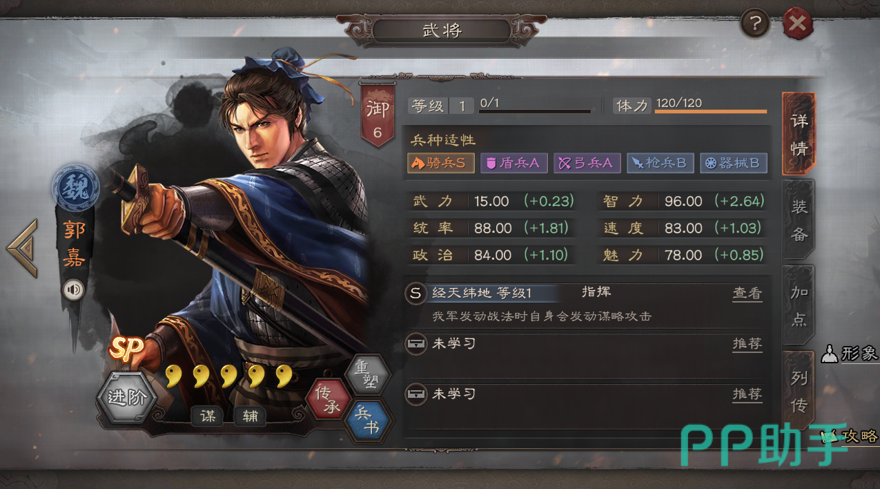 新武将SP郭嘉的加入,让魏智阵容能够成功起飞,尤其是这队五谋象的阵容更是厉害,SP郭嘉不仅能赋予无视防御输出的程昱、利用混乱让敌人自相残杀的贾诩打出高额奇谋伤害,还拥有让其回血的攻心效果,让队伍输出生存能力提升一大截,因此抽到新武将的小伙伴,快快放弃原来的魏骑,改用新版的五谋象阵容吧!相信大家可以轻轻松松打出上万战功出来哦!
