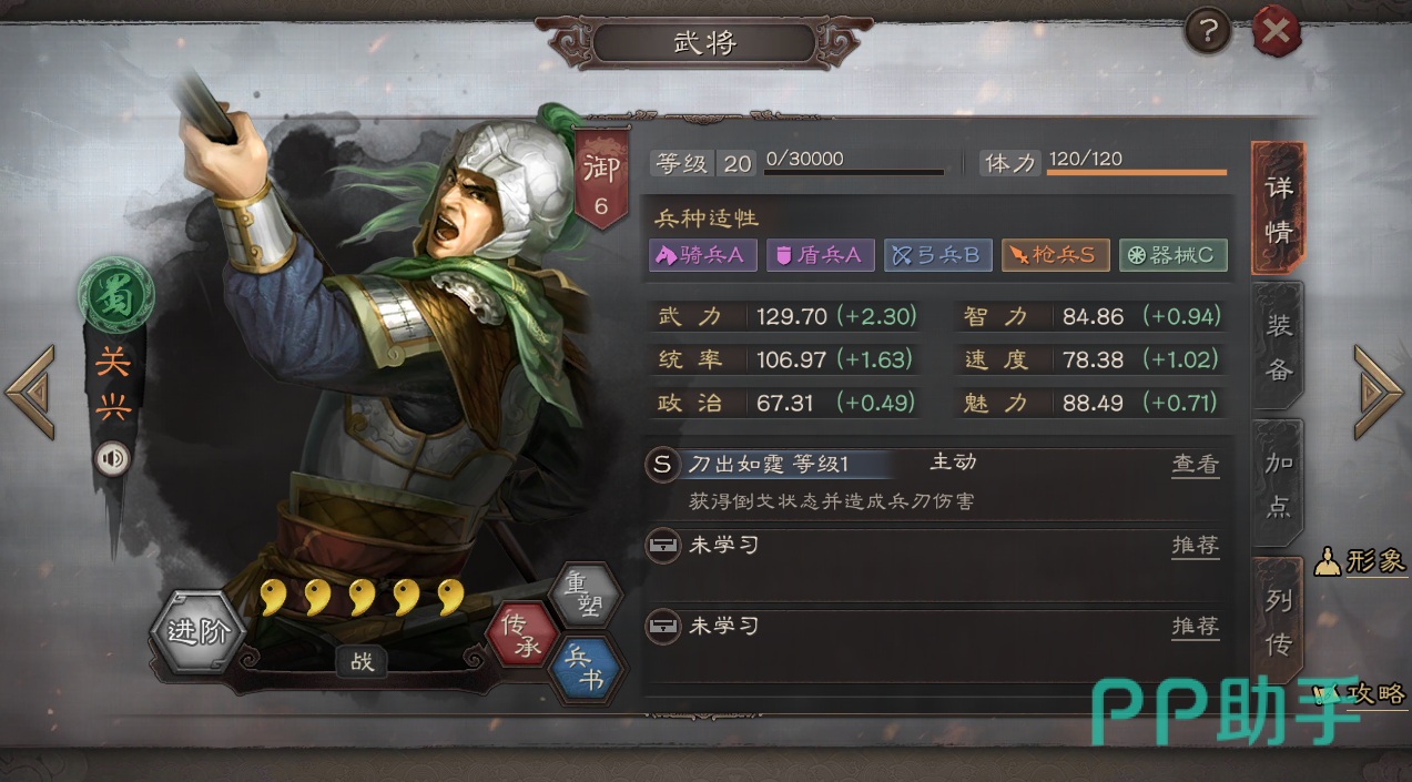 sp诸葛亮(暂避/士别/携魂+整装/刮骨)+关兴(破阵/破军+青州兵)+张苞(白眉+强攻/兵锋)