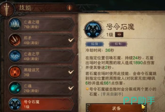 最后一个技能可以考虑使用石魔号令,这个召唤物坦度极高而且自带控制,后期还可以搭配传奇来提升持续伤害,可以帮助我们在被敌人围攻的时候使用,可以迅速的逃脱。