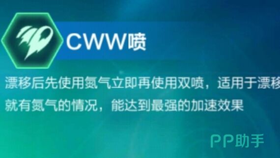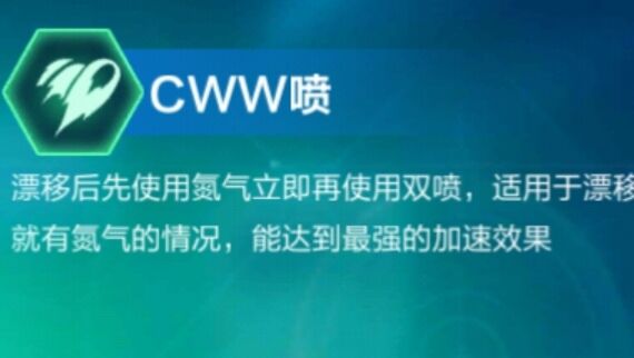 cww喷在飞车技巧中属于基础技巧,玩家可以现在训练场中对其训练,它的操作是将cw喷与双喷两者的结合体。cww喷的介绍是飘移后先使用氮气立即在使用双喷,适用于飘移前就有氮气的情况,能达到最强的加速效果。下面让我们详细说一下操作过程吧!