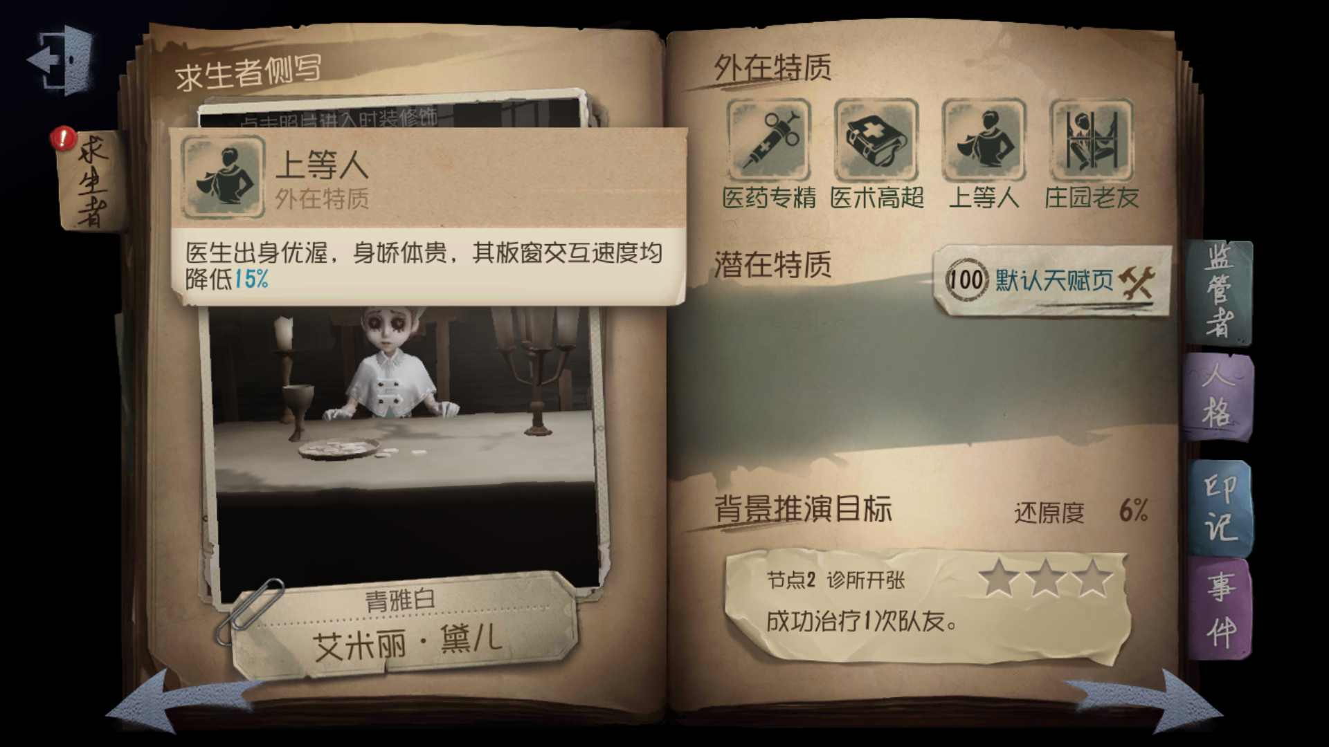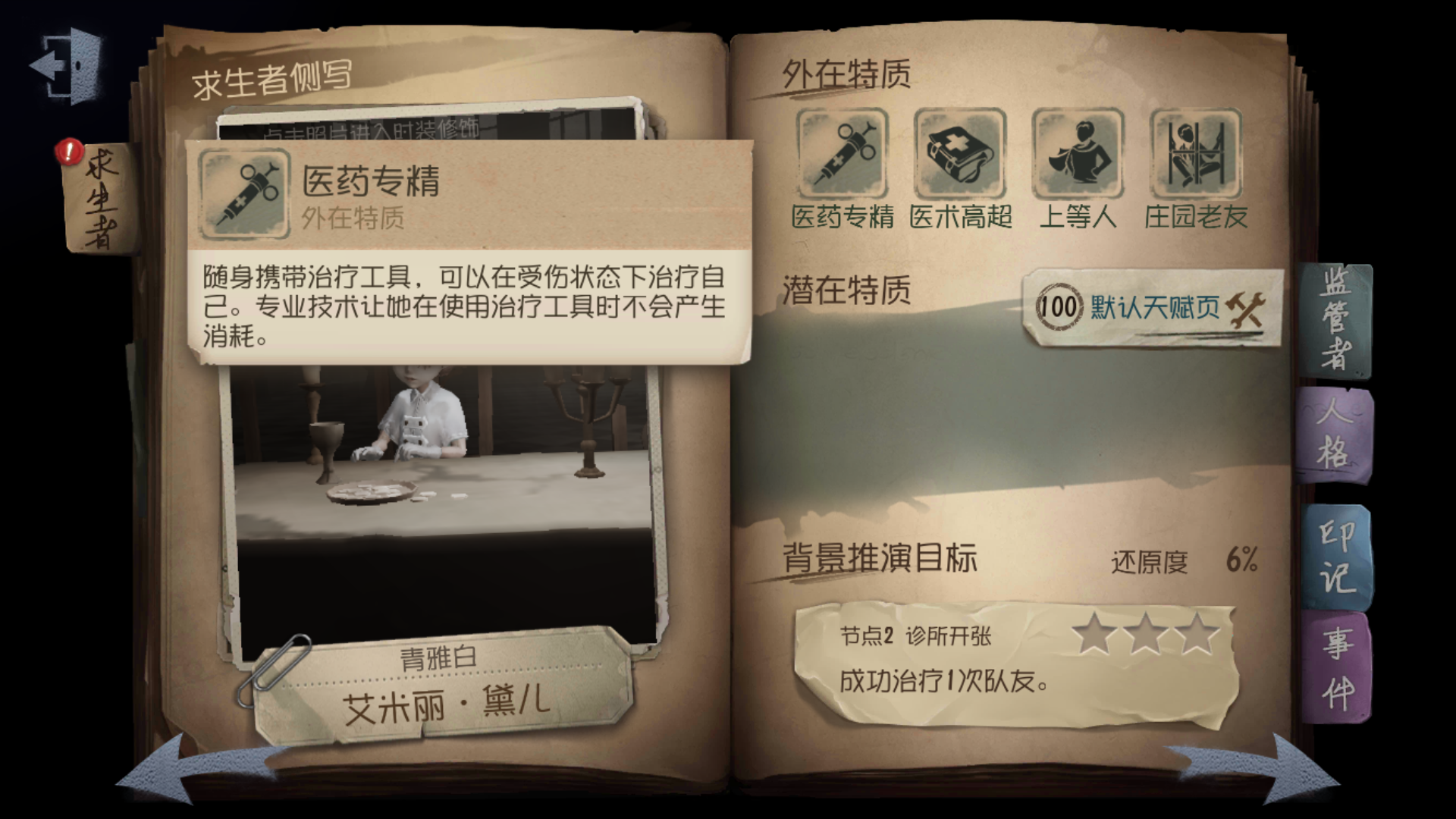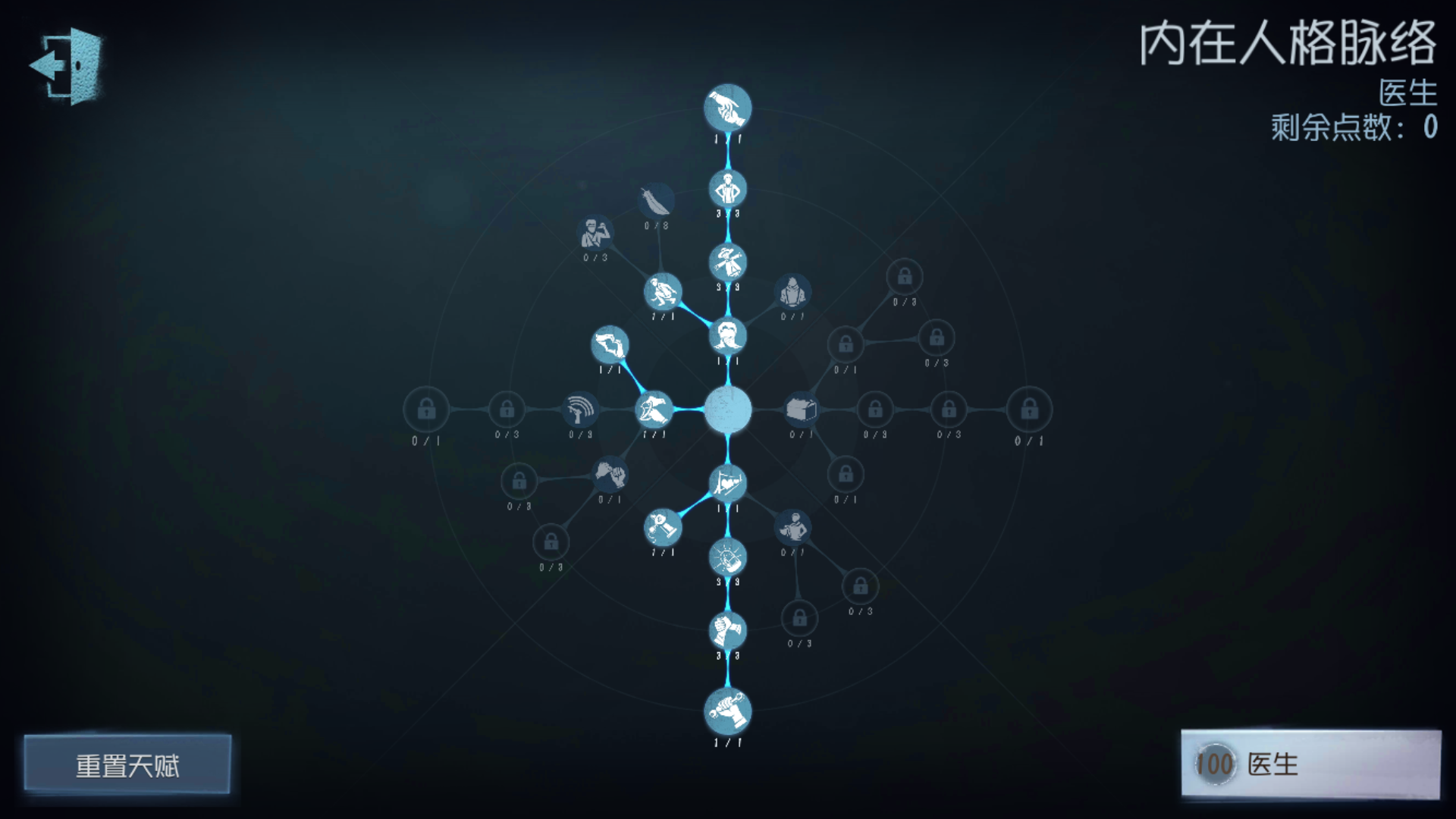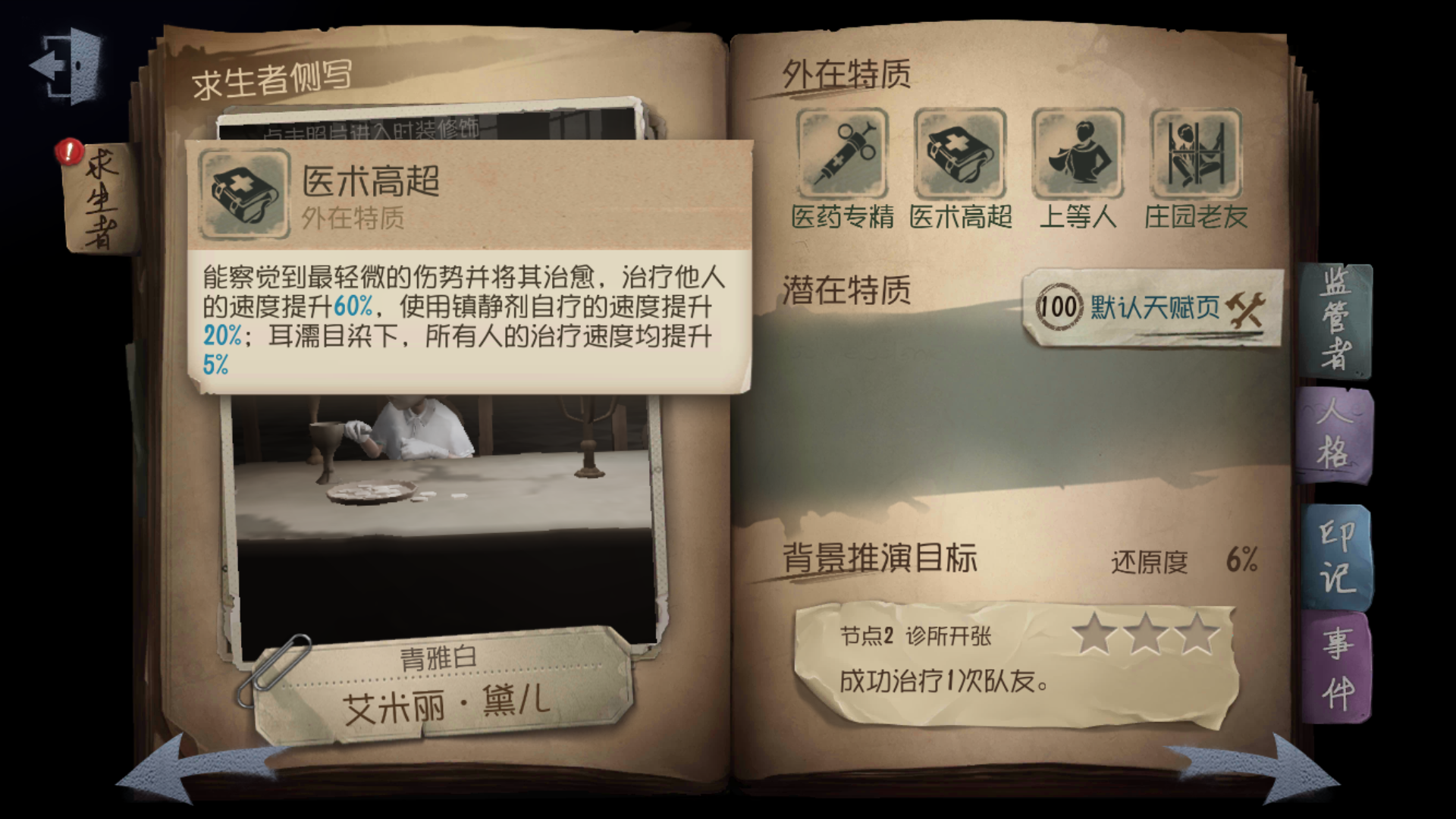 作为一名奶妈,肯定要发挥自己治疗的优势。所以内在人格建议将上下分支点满,分别点出【旁观者】和【化险为夷】。这两个技能一个是在治疗他人时提升20%的速度,加上自身的60%,就是80%了,可以说是高效治疗;另一个在救人之后会无敌20秒,虽说这20秒后期间受的伤害会返回,但是如果能甩掉监管者,医生还可以回去救人嘛,稳赚不赔的。