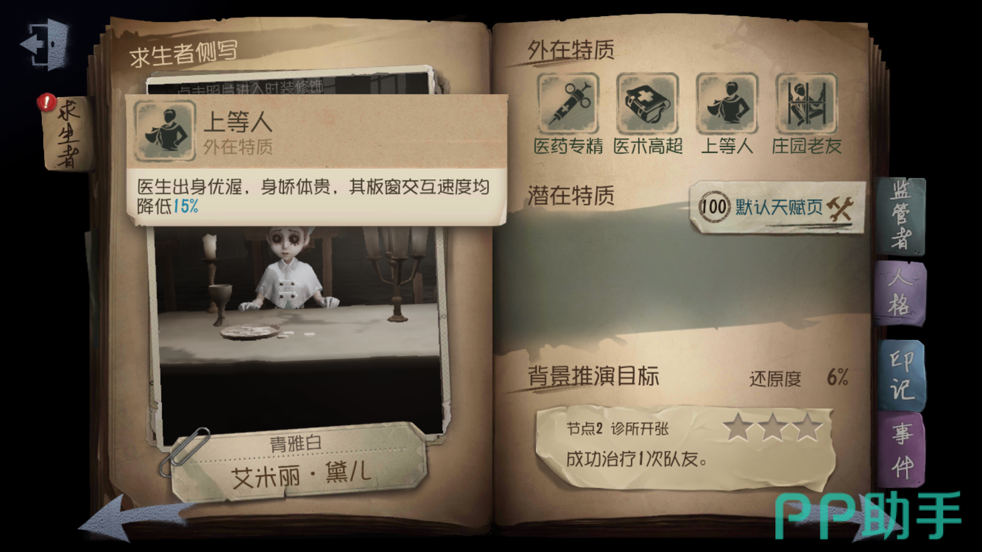 第五人格中的医生是初始游戏送的求生者,虽说是送的,但是医生由于自身的特质使得她容错率高,是经常被玩家使用的角色之一。那么第五人格的医生怎么玩呢?下面由豌豆荚小编来为大家讲解一下医生的玩法。