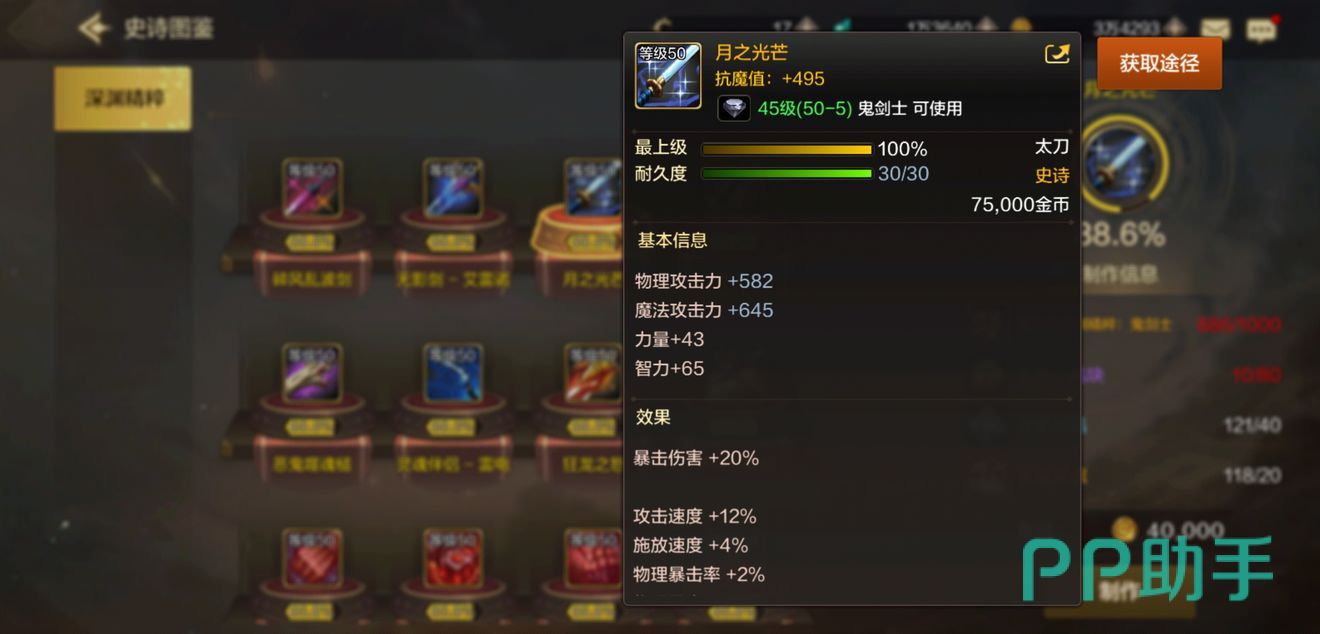 【月之光芒】:这把武器基本上算是鬼剑士全职业的毕业武器,毕竟20%的暴击伤害加成非常稳定,而且又是太刀攻击手感也是非常不错的。此外副属性也提升了不少的双速,入手难度也不高,大家刷不出来后面也可以直接点碎片合成。