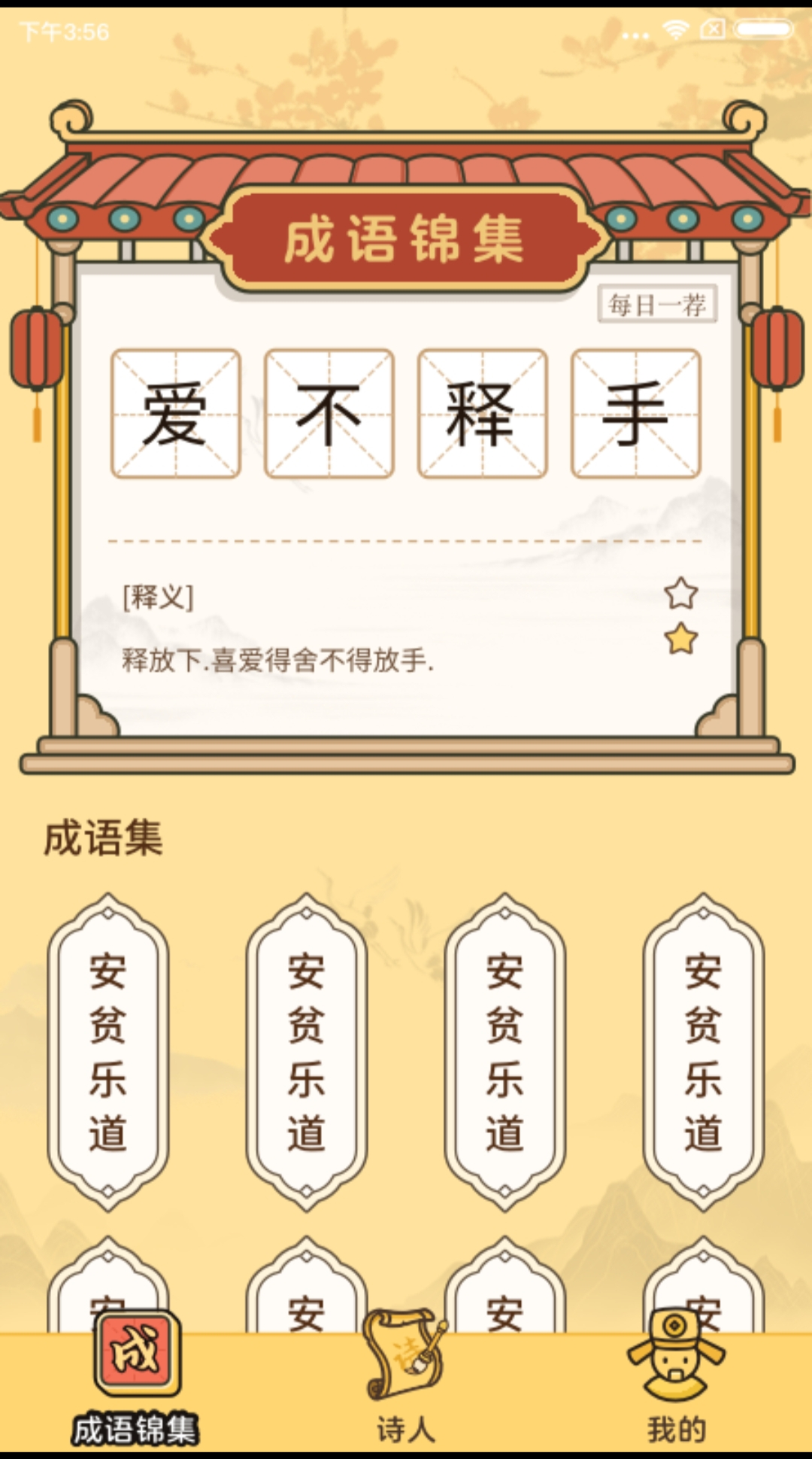 成语达人顾名思义就是一款休闲益智的成语学习游戏,里面有各个朝代诗人、词人的诗词应有尽有,能够让玩者在中华传统文化的海洋里畅游,成语故事也是引人入胜,学多少,懂多少,优秀的古典文字知识就在成语达人等你来看哦!