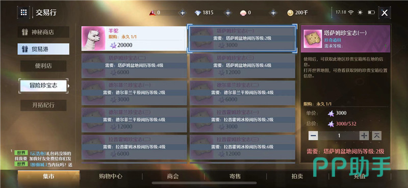 珍贵的宝箱游戏中是不可以直接找到的,需要玩家去交易行的冒险珍宝志中购买藏宝图,不同区域和等级的藏宝图需要一定的区域阅历等级才能购买,价格在3000到12000幻晶不等,价格越高获得的宝箱物品也会越好。获得藏宝图之后就可以根据藏宝图上坐标的指引找到珍贵宝箱了,珍贵宝箱可以开出非常多丰厚的道具物品。
