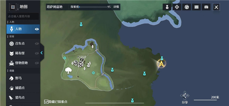 玩家可以打开游戏地图,在地图中未解锁的传送点如下图是一个蓝色的小塔的形状,解锁过的传送点是白色的小塔形状。玩家只要点击蓝色的小塔图标就可以自动寻路达到未解锁的传动点了。